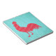 A red, quatrefoil patterned silhouette of a rooster is on a turquoise colored background with a wood grain texture.
