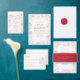 Red peonies border the elegant typography of this wedding suite. You may customize the text for your event.