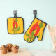 Red peppers art on oven mit. Bright and bold peppers with orange background.