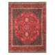 The city of Mashhad has long been one of the centers for production of famous Persian carpets. It is also one of the oldest centers of carpet weaving. This particular rug is signed by master weaver Saber. The familiar medallion carpet is usually a symmetrical the design that often features a scalloped or starburst circular design in the center of a floral background