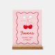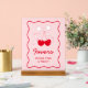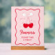 Celebrate your cherry baby shower theme with this Personalized Red Pink Bow Cherry Baby Shower Favor Acrylic Sign. Perfect for a berry sweet baby shower theme or February baby shower themes, this charming sign adds a delightful touch to your cherry on top baby shower theme and celebrates the little one who truly is "she's the cherry on top."