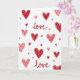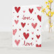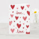 This card shows a repeating pattern of hearts scattered all over a bright white background. The hearts come in different sizes and shades of red and pink, from deep red to soft rose, and they feel warm and sweet 💕. Some hearts are filled in solid, while others have diagonal stripes or tiny dots inside, and a few small hearts sit between them like confetti. Mixed in with the hearts, the word “love” appears several times in flowing cursive-style lettering. The “love” text is placed between the hearts and stands out clearly against the white background. Overall, the look is cheerful and romantic, with a simple design that feels friendly and easy to enjoy ❤️.