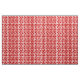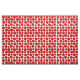 This fabric has a mid-century modern design of red pinwheels made with red circles and black "spokes" on a white background.