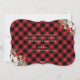 Elegant red buffalo plaid New Year card featuring a watercolor painting of poinsettia, holly and red berries along with string lights on a red and black buffalo plaid background. Easily personalize online.