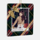 Elegant and festive special memory family photo multi-colored red & green plaid faux fabric pattern ornament. Designed to resemble a Christmas present. We've decorated the ornament with a beautiful gold bow and ribbon. Single photo layout on each side of the ornament to display your special family photo or your kid's photo with custom caption on each side. Plaid design created by Moodthology Papery.