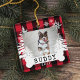 Rustic farm fresh Christmas trees pet photo keepsake ornament. The ornament can be customized with the pet's name, the year, and the photo. Red checkerboard plaid background with rustic pine trees and snowflakes. The pet's name is displayed on a white dog bone. Artwork by Moodthology Papery.