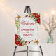 Celebrate your winter wedding in festive elegance with this Christmas-themed welcome sign featuring watercolor red poinsettias, gold stars, holly berries, and evergreen foliage. The design showcases a luxurious gold geometric frame on a soft winter background, creating a warm and inviting entrance for your guests. Perfect for Christmas weddings, winter receptions, and holiday vow renewals. Personalize with the couple’s names and wedding date for a timeless, custom touch that beautifully complements your holiday décor.