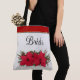 Winter festivities deserve special accessories, and this roomy tote bag is the perfect solution. It features a white textured-look background with beautiful red poinsettias and gold accents. It can be personalized with a name, initials, wedding date, etc. Great gift idea for brides, bridesmaids, or anyone that loves a little Christmas holiday spirit.