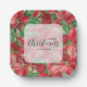 Personalized paper plates feature modern, elegant red poinsettias with Merry Christmas and your name in chic lettering. MATCHING items in our collection.