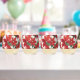 A set of four clear glass tumblers, each adorned with vibrant red poinsettia flowers and green leaves. The floral design wraps around the glasses, creating a cohesive and festive look. The glasses are arranged in a straight line.