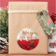 Stickers with a festive holiday photograph featuring a bouquet of red poinsettias along the bottom. Shimmering golden bokeh lights in the background. Classy sophisticated style. Merry Christmas typography written in a trendy red font.