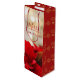 A wine gift bag with a festive holiday photograph featuring a bouquet of red poinsettias along the bottom. Shimmering golden bokeh lights in the background. Classy sophisticated style. Merry Christmas typography written in a trendy red font. The background has a pattern of old snowflakes on a dark red color.