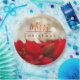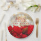 Paper plates with a festive holiday photograph featuring a bouquet of red poinsettias along the bottom. Shimmering golden bokeh lights in the background. Classy sophisticated style. Merry Christmas typography written in a trendy red font.