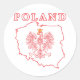Simple design features a red map outline of Poland with the Polish White Eagle, the coat of arms or crest of Polska in the center. The word Poland is above the map.