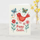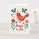 This design shows a spring-themed illustration on a soft, creamy background, centered on a stylized red bird with creamy white polka dots across its belly. Two butterflies hover above like friendly companions, one in cool blues with soft pink touches and the other in teal with bright orange accents, their curled antennae leaning toward each other as if sharing a secret. Along the bottom, a garden of blooming flowers spreads out in rosy pink, calm blue, and deep red, with smaller blossoms tucked between and dark green circular dots sprinkled around for rhythm. The greeting “Happy Easter” sits across the lower half in flowing lettering, set in a dark tone that stands out clearly against the pale backdrop. The layout feels affectionate and welcoming, as if the bird is proudly presenting the message while the butterflies dance nearby, with a small 🌷 touch in the overall mood. Subtle shading adds a gentle lift to the bird, butterflies, and petals without making the scene look heavy. The flowers cluster in layers near the base, with the darkest greens and reds nearest the bottom edge.