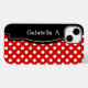 Stylish iPhone case designed with a white polka dots over red pattern, a black frame over the left side, and personalized with your name or custom text in white across the black frame. This design is perfect for vertical and horizontal use of the mobile phone.