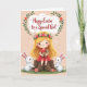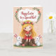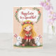 This card shows a springtime scene glowing with soft light on a pastel peach background 🌷. In the center, a young illustrated girl with long blond hair wears a rose-and-leaf wreath and a red dress with white polka dots, sitting on a rough tree stump while cuddling a tiny spotted woodland fawn close to her chest. On both sides, two fluffy white rabbits with rosy cheeks lean in toward her, their ears tipped inward as if sharing a quiet, friendly moment 🐰. Above them, a cloud-shaped label holds the greeting text in a dark red, rounded handwritten style, centered neatly near the top. The cloud frame is wrapped with curling green vines and small red blossoms that trail along the edges. Near the bottom, short green grass tufts and a few simple flowers dot the ground, adding little bursts of red and white. The rabbits’ soft fur is shaded in pale gray, and the stump shows warm brown rings and textured bark.