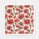 Paper napkins in a delicate pattern of vibrant red poppies with deep green stems and leaves, on a while background, with, each poppy bloom uniquely curved and twisted, as if swaying gently in the breeze.