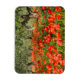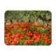 Rectangular photo magnet with a field with red poppy flowers under old olive trees in an orchard in the countryside of Italy in summer.