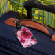 A digital painting of a ranunculus flower is printed on the front of the luggage tag. Please using the editing tool and change the text on the back of the luggage tag to your contact information.