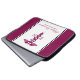 Personalized laptop sleeve with a stylish red cadaceus symbol with the letters R N on either side. Simple minimalist design.