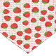 Table runner in a scattered pattern of red ripe strawberries on a red and white pin dot background
