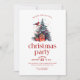 A Christmas-themed party invite featuring Christmas trees with presents and a red robin watercolor. Festive party invitation for you to invite your guests for a holiday party.
