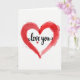 This card shows a large red heart painted in loose watercolor strokes on a white background. The red shifts from deep crimson to lighter washes, with uneven edges that make it feel honest and full of feeling. Small red paint splatters sit around the heart like a soft scatter, adding a little movement without taking over. Inside the heart, the words “love you” appear in flowing black cursive-style lettering, centered and easy to read. A tiny solid red heart replaces the dot over the “i,” tucked right above the letter as a sweet detail. The simple white space around everything keeps your attention on the message and the warm red color ❤️. It feels meaningful because it says what you want to say in a direct, caring way, whether it’s for a partner or someone close 🥰. Hope it helps you share your Valentine’s Day sentiments.