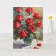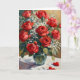 An impressionist painting of red roses and white baby's breath on a cloth covered table creates a sweet and romantic Valentine's Day card.