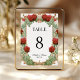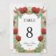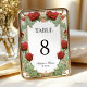 This romantic table number card features deep red roses, trailing ivy, and an ornate gold frame inspired by vintage art. Perfect for formal, fairytale, or rose-themed weddings. Includes editable text for names, date, and numbers. For a more cohesive look for your event, pair it with the matching welcome sign and seating chart.