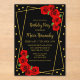 Gold and black birthday invitation with vibrant traditional red roses and classic script typography