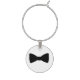 Graphic drawing of bride and groom formally dressed and a bow tie for the best man and bouquet for the maid of honor wine charms in grey, black, white and flowers in red. Modern bouquet dress wedding design part of a wedding stationary set. Ideal to place on reception dinner tables or party tables to avoid glass mix ups a great little gift idea for the happy couple. Art and design by Sarah Trett.