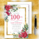 Beautiful red and white roses are nestled in holly and eucalyptus leaves to create an elegant floral display. They decorate a wide gold frame and are dappled with gold confetti dust. 100th birthday celebration and the person's name is written in a large red text. There is more room on the back of the postcard to create a special message to your guests. All of the text can be edited. Perfect choice for a special winter birthday celebration.