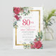 Beautiful red and white roses are nestled in holly and eucalyptus leaves to create an elegant floral display. They decorate a wide gold frame and are dappled with gold confetti dust. 80th birthday celebration and the person's name is written in a large red text. All of the text can be edited. Perfect choice for a special winter birthday celebration.