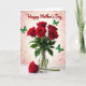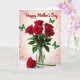 Designed with a soft, romantic touch, this card centers on a bouquet of five deep red roses standing upright in a clear glass vase, their velvety petals and leafy green stems shown in sharp detail ❤️. A single rose rests on the white surface below, angled gently as if set down with care, echoing the rich red tones of the bouquet. Three small emerald-green winged insects hover around the flowers, adding a light sense of movement against the reds and greens. The background fades into a warm, peachy blur that feels like a quiet spring morning and keeps the focus on the roses. Near the top, a flowing red calligraphic greeting is placed above the bouquet, balanced so it doesn’t crowd the flowers. The glass vase catches faint reflections and highlights, giving the arrangement a fresh, just-set-on-the-table look 🌼. Behind everything, the soft bokeh blends pale peach and cream tones with no hard edges.