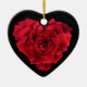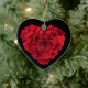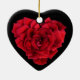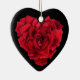 Vibrant red roses arranged in the shape of a heart on black, heart shaped ceramic ornament.