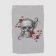 This sports towel has a pencil sketch of a skull with swirls coming out of it and red rose vines trailing around it.