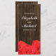 A country themed wedding program featuring red roses on a rustic dark brown barn wood background. Easily customize for your event.