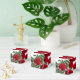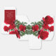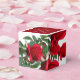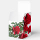 Wedding shower or reception favor boxes with red roses design. Customize text on box top with white script over dark red background. The sample message is, "Much love and thanks for being here today - names of couple". Stems of beautiful red roses wrap around the edge and bottom of these cute little boxes which are 2 inches square and will be put together by the purchaser. This design may transfer to other sizes and shapes. They will print as shown, so do not let any wording get covered or go off the edge.