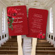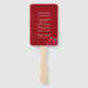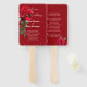 Red roses wedding program on a hand-held fan. Rectangle shaped, and printed on both sides, fans come assembled for extra cost. Realistic red roses and buds decorate both sides with a deep red background color and white text templates. On the front, add a title, full names of the couple and list the order of the ceremony. Include names of the officiant and wedding party on the back. Use the paragraph to create a thank you message, or any wording that will fit the space. This design and wording transfers to any of the other fan shapes, except the heart. And do not let any wording get close to the edges.