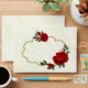 beautiful red flowers and green leaves on gold frame against pale gold marble wedding envelope
