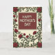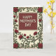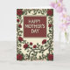 This greeting card features a tall, vertical layout with a deep maroon panel centered like a framed window. Across the middle of that panel, the words “HAPPY MOTHER’S DAY” appear in a cream-colored serif font, with a faint shadow that gives the letters gentle depth. Around the message, a thick border of fully opened red roses and dark green leaves wraps the design, their layered petals leaning toward one another like a quiet, caring embrace ❤️. The outer background is a soft cream tone that lets the darker colors feel rich without looking heavy. Curving vines and clustered foliage weave between blooms, creating the look of a garden border arranged with careful affection. The text stays neatly centered while the flowers vary in size along the edges, guiding your eye upward and downward like a slow, admiring glance. In the corners, the roses sit closer together, with dark green leaves curling inward against the cream frame 🌼.