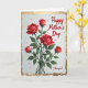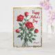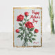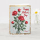 This card features a lush bouquet of five red roses at the center, with blooms ranging from snug buds to fully opened petals that look soft and velvety ❤️. Deep green stems and leaves spread upward from the lower middle, giving the arrangement a natural, gently gathered look. The background is a pale, calm tone, sprinkled with tiny red heart shapes that float like quiet hints of romance. In the upper right, a celebratory greeting appears in flowing cursive-style lettering in bright red, echoing the rose color. A shorter line of text sits in the lower right in the same red, like a tender note meant for someone close 🌼. An uneven, organic-looking gold border frames the whole design, with a slightly textured shine that stands out against the smooth backdrop. The roses sit just left of center, while the red lettering balances the right side inside the shimmering gold frame.