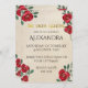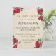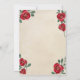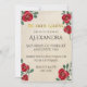 This custom party invitation features a Beauty and the Beast fairy tale theme on a rustic, parchment paper design. A vintage style blue parchment paper design background featured red roses in the corners, with gold glitter accents. The phrase, "Be Our Guest" is printed in a vintage style, medieval gold font.