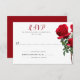 Red rosebuds reply card. White cards with black, printed text have simple and traditional RSVP wording. Real red rose stems with greenery decorate the righthand edge of the cards. Include a line for guests to give a count to get an exact guest number. Or change the wording to your preference. Reverse is solid red color.