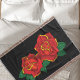 Two red roses in a backdrop of black all drawn in a traditional tattoo style.
