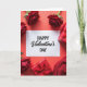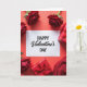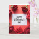 On the front of the card is a white card placed on a deep red background, with the message “HAPPY Valentine’s DAY” printed across the center. The words are in a flowing cursive style, with “HAPPY” and “DAY” in uppercase and “Valentine’s” in the middle, all in dark ink that stands out clearly. Around the card sit four red roses with open petals and green stems, arranged to frame the message with a romantic feel. Two small red gift boxes are also nearby, each wrapped neatly with a matching red ribbon and bow. In the lower right corner, there’s a piece of soft red fabric that looks like a scarf, adding a cozy touch to the scene. The lighting is gentle and even, so you can see the petals, ribbons, and paper edges without harsh shadows. Overall, everything leans into classic Valentine’s colors and simple romance, making it feel warm and sweet 💕❤️.
