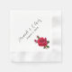 Wedding napkins with red roses and names of the couple with date of event. Realistic rose stems with leaves decorate white napkins that come in many styles. The text is angled for placing napkins for a buffet. Use for pre-wedding parties, a bridal shower, and wedding reception.