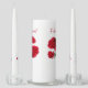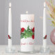 Wedding unity candle set with red roses design and custom lines of text. Three candles come in this set with the largest containing text templates. Include a favorite saying or verse across the top and names and / or date at the bottom. Red roses and buds with leaves wrap around both the tapers and the center candles which are white. Use for a unity ceremony to match red wedding palette, or as a pretty floral centerpiece.