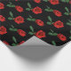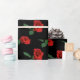 This elegant wrapping paper features a repeating abstract pattern of a single red rose with green leaves set on a pure black background.